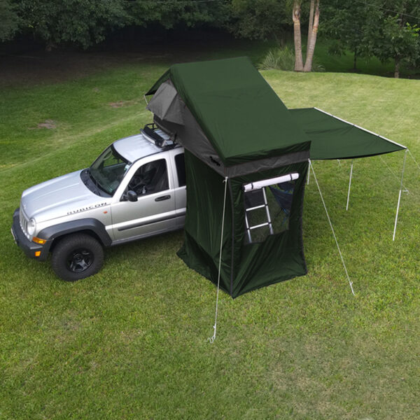 É a cereja do bolo é que ele também vira toldo, onde uma lateral pode ser transforma da em toldo ao ser erguida, projetando uma boa sombra para seu acampamento, podendo fazer regulagem de altura para chuva. Sua fixação é fácil e a praticidade vai te surpreender. O toldo repele a água mas deve ser baixado a altura para proteger da chuva (evitar empoçar água).