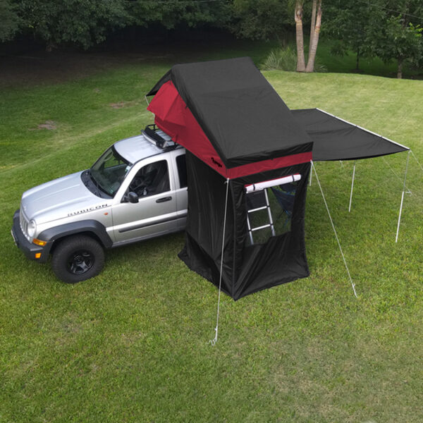 É a cereja do bolo é que ele também vira toldo, onde uma lateral pode ser transforma da em toldo ao ser erguida, projetando uma boa sombra para seu acampamento, podendo fazer regulagem de altura para chuva. Sua fixação é fácil e a praticidade vai te surpreender. O toldo repele a água mas deve ser baixado a altura para proteger da chuva (evitar empoçar água).