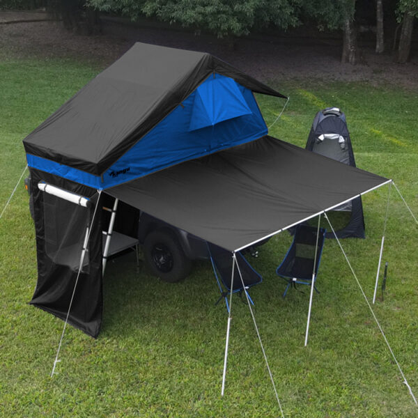 É a cereja do bolo é que ele também vira toldo, onde uma lateral pode ser transforma da em toldo ao ser erguida, projetando uma boa sombra para seu acampamento, podendo fazer regulagem de altura para chuva. Sua fixação é fácil e a praticidade vai te surpreender. O toldo repele a água mas deve ser baixado a altura para proteger da chuva (evitar empoçar água).