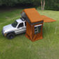 É a cereja do bolo é que ele também vira toldo, onde uma lateral pode ser transforma da em toldo ao ser erguida, projetando uma boa sombra para seu acampamento, podendo fazer regulagem de altura para chuva. Sua fixação é fácil e a praticidade vai te surpreender. O toldo repele a água mas deve ser baixado a altura para proteger da chuva (evitar empoçar água).